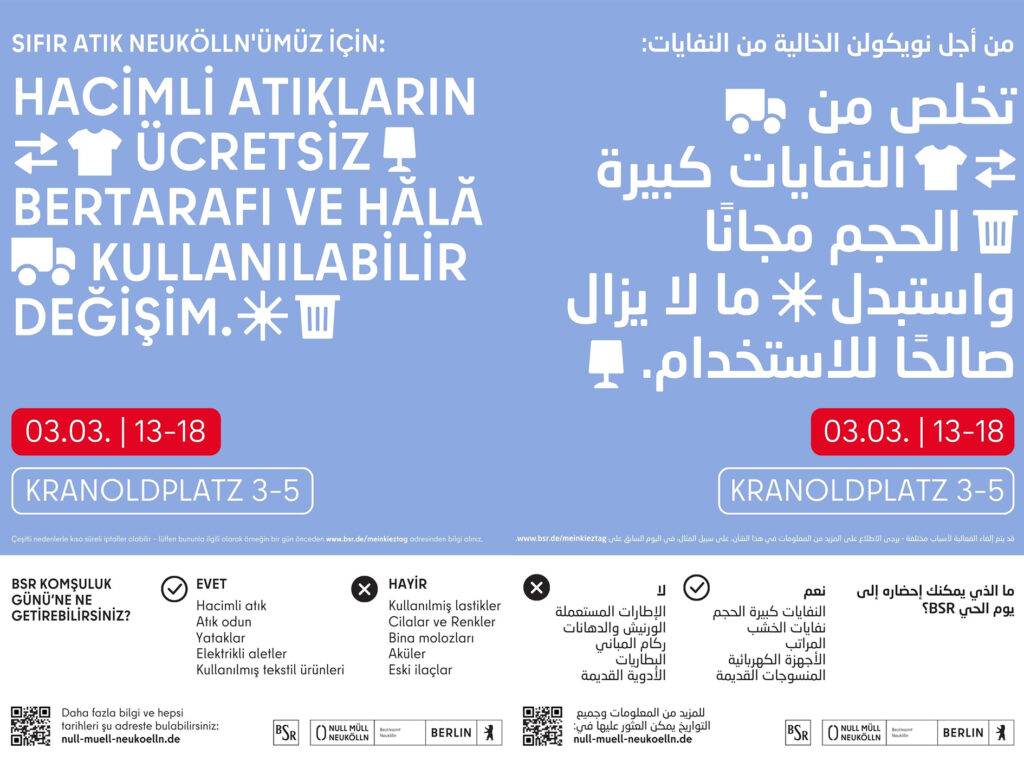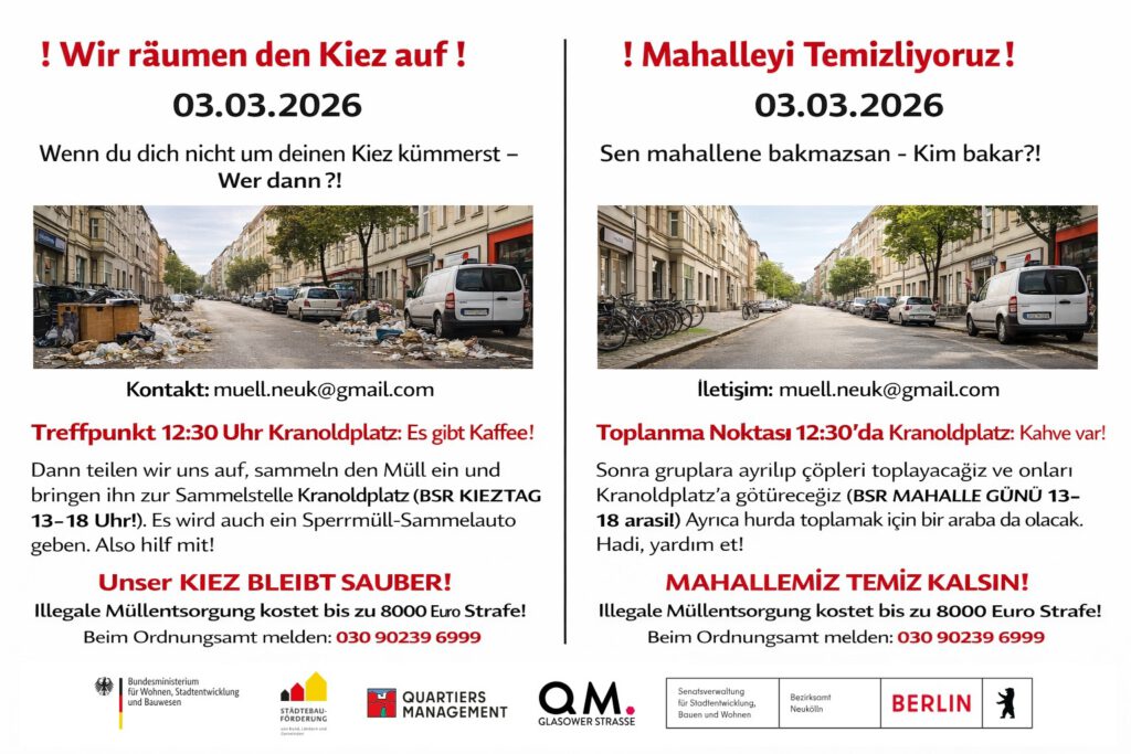 Wer einen Frühjahrsputz geplant hat, sollte sich den 3. März 2026 vormerken. Da findet auf dem Kranoldplatz wieder von 13 bis 18 Uhr der BSR-Kieztag statt. Man kann seinen Sperrmüll loswerden, aber auch Dinge vorbeibringen, die man selber nicht mehr braucht, andere aber schon. Was am Ende des Tages nicht mitgenommen wird, kann wieder in den Re-Use Kreislauf geführt werden, unter anderem in die NochMall, dem BSR Gebrauchtwarenkaufhaus.