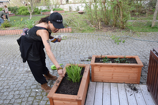 Der Einladung zum Gartentag am 16. April 2026 in den Familienpunkt Neukölln waren zwar nicht viele Familien gefolgt, aber die, die mitmachten, haben sich sehr engagiert bei der Neugestaltung der Beete. Ursula Müller, Projektleiterin von „Gutes Klima für den Kiez“, war mit dabei und gab Tipps für das ökologisch nachhaltiges Bepflanzen von Garten und Balkon. Und sie hat angefangen, den zugewucherten Weidentunnel zurechtzustutzen, damit er wieder austreiben kann. Gärtnerin Andreza kümmerte sich um die Hochbeete, die frisch mit Blumen und Kräutern bepflanzt und besät wurden.