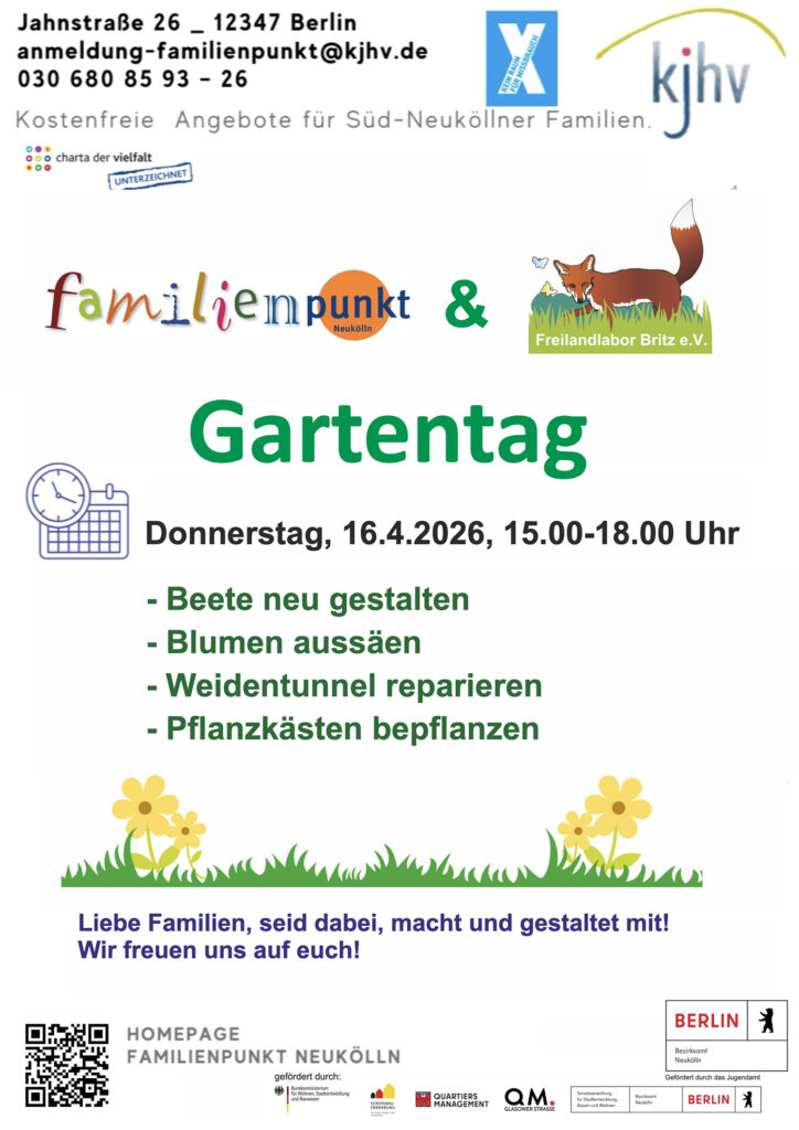 Am 16. April 2026 sind von 15 bis 18.00 Uhr Familien eingeladen, im Garten des Familienpunktes Neukölln, Jahnstraße 26, die Beete neu zu gestalten, Blumen auszusäen, den Weidentunnel zu reparieren und die Pflanzkästen neu zu bestücken.