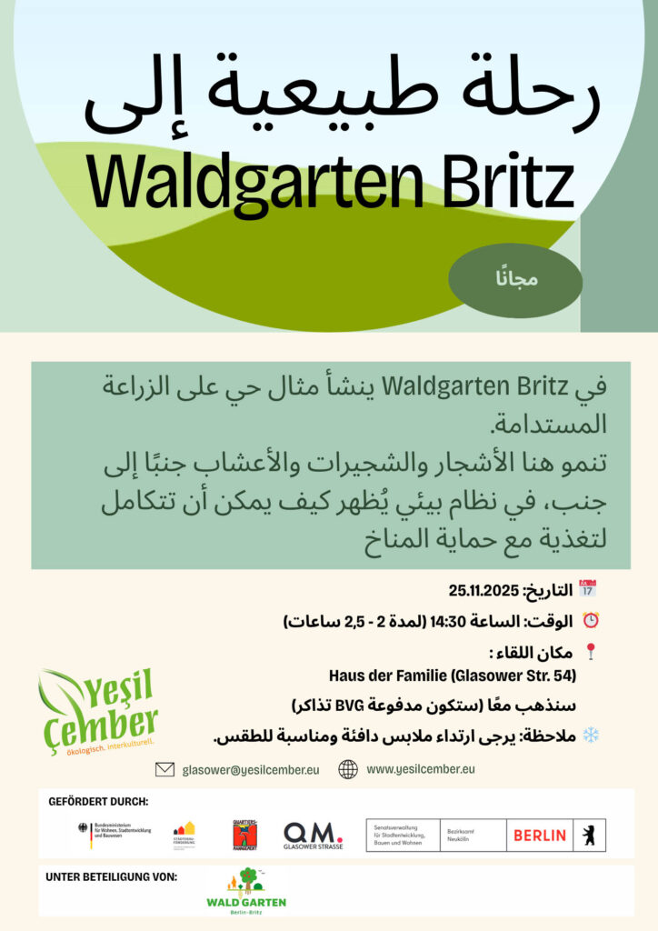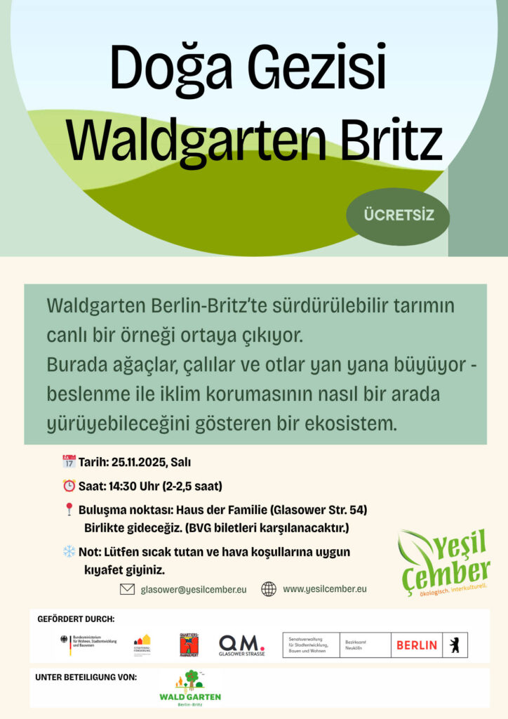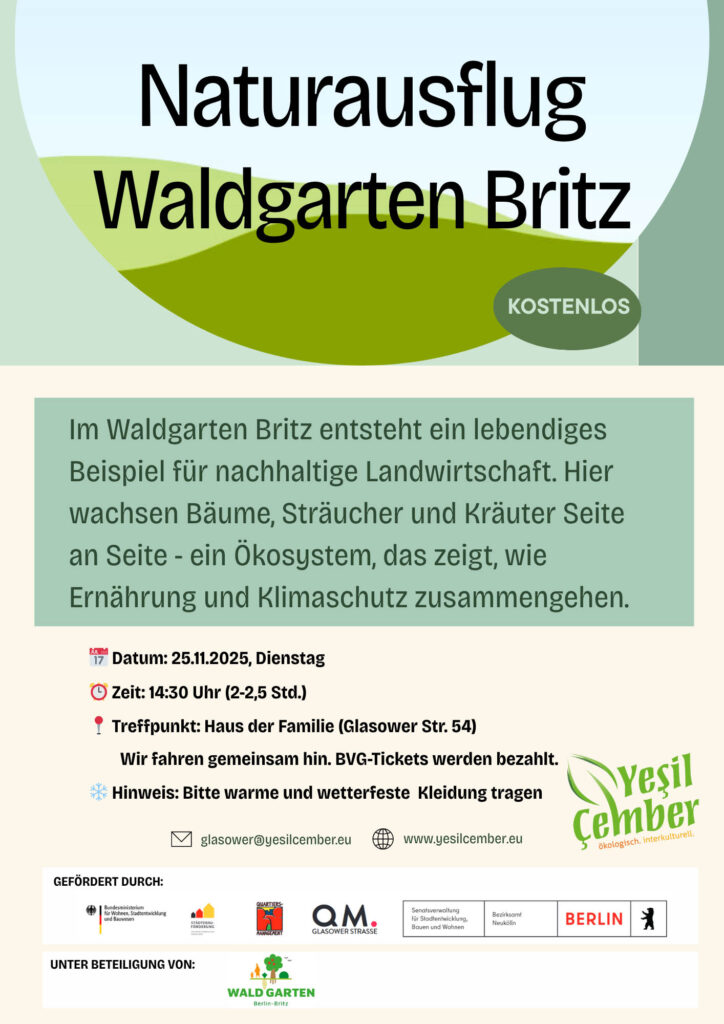 Bis Mitte Dezember wird weiterhin im Haus der Familie jeden Montag gekocht im Rahmen des Projektes „Empowerment für eine gesunde und nachhaltige Ernährung“. Am 25. November 2025 ist ein Ausflug zum Waldgarten Britz mit seinem Gemeinschaftsgarten geplant. Er ist ein lebendiges Beispiel für biologische Vielfalt und naturnahes Gärtnern mit 200 verschiedene Pflanzenarten, hunderten Bäumen und mehr als 10.000 Stauden. Treffpunkt ist um 14.30 Uhr am Haus der Familie, Glasower Strasse 54.