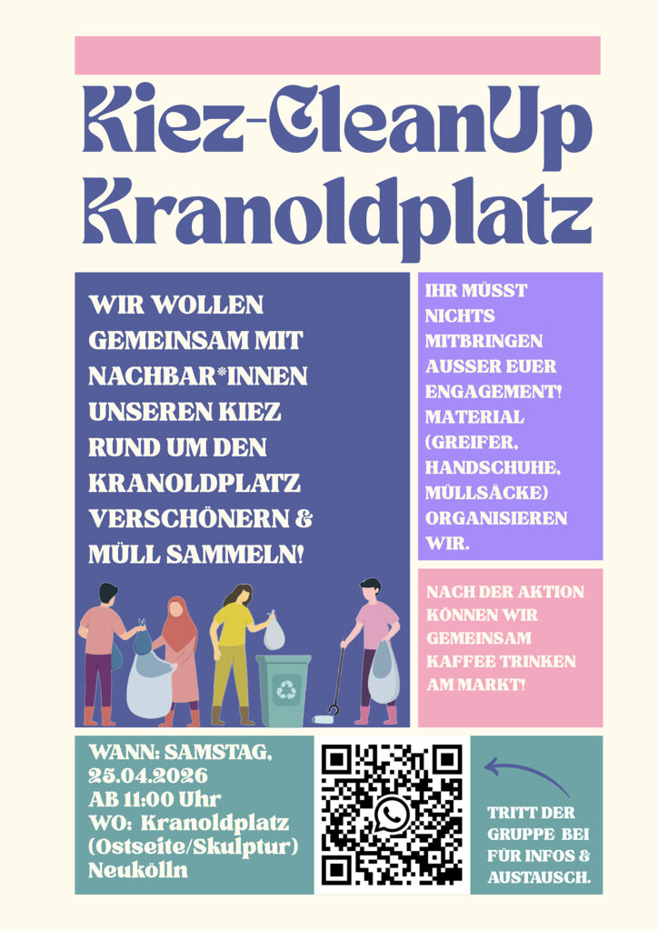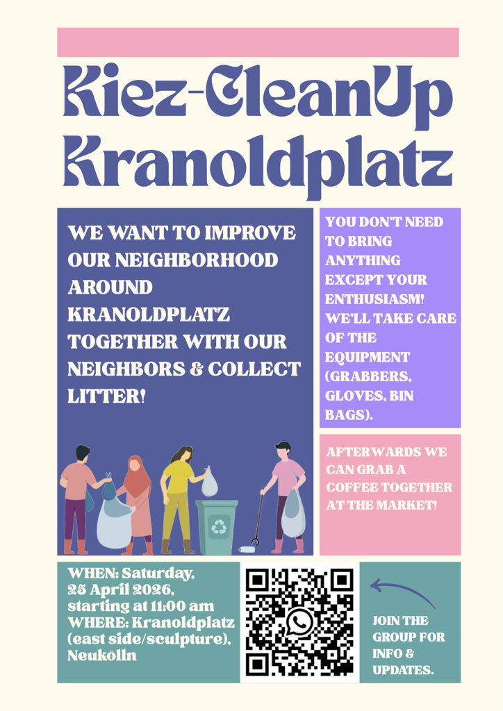 Wenn die ersten Sonnenstrahlen auf die staubigen Fenster treffen, beginnen die meisten mit dem Frühjahrsputz. Und wenn es drinnen schön sauber ist, soll es auch draußen so sein. Deshalb ruft eine Gruppe von Bewohnerinnen und Bewohnern für den 25. April 2026 zu einem „Kiez-CleanUp“ auf den Kranoldplatz auf. Ab 11 Uhr wollen sie mit anderen den Kiez rund um den Platz von Müll befreien und so verschönern. Außer Engagement und Spaß muss nichts mitgebracht werden, Greifer, Handschuhe und Müllsäcke sind vorhanden. Treffpunkt ist die Skulptur auf dem Kranoldplatz. Nach der Aktion ist dann gemeinsames Kaffeetrinken angesagt.