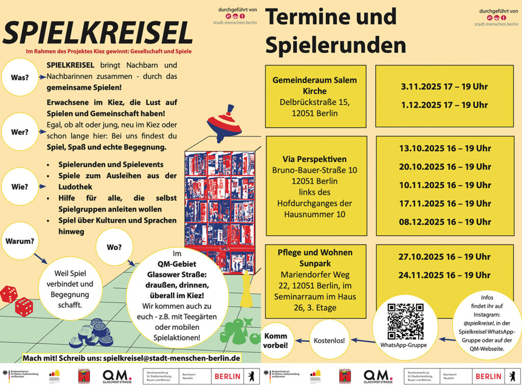 Die Runden stehen der ganzen Nachbarschaft offen, die Teilnahme ist kostenlos und ohne Anmeldung möglich. Es gibt eine Auswahl von Brett- und Gesellschaftsspielen, dazu Getränke und Snacks. Eigene Spielideen oder Vorschläge sind natürlich auch willkommen.