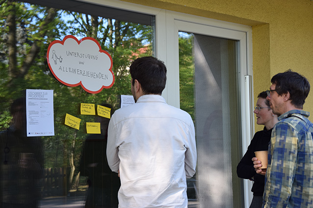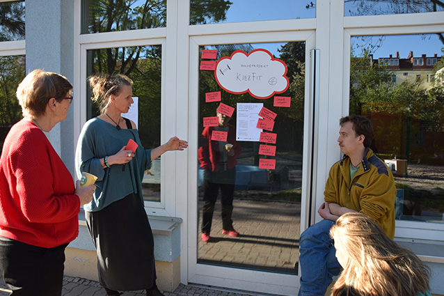 Zum Thema „Lernförderung und Kinderbibliothek“ wurden ein Büchermobil, Leseausflüge und Vorleseaktionen in Kooperation mit Schulen und Pflege- und Wohneinrichtungen vorgeschlagen. Zur Unterstützung Alleinerziehender gab es die Idee von „Kiez-Engeln“ sowie Möglichkeiten des Austausches, beispielsweise an einem Stammtisch, und der Hilfe über die Stadtteilmütter. Beim Kindertheater wurde nachgedacht, welche Kooperationen sinnvoll wären, um Proben und Auftritte zu ermöglichen. Bei „Straßensozialarbeit“ ging es darum, eine Kontaktstelle zu schaffen, die Hilfe vor Ort leisten und Unterstützung vermitteln kann sowie Maßnahmen zu ergreifen, um rund um Kinder- und Jugendeinrichtungen den Drogenkonsum zu verhindern. Für die „Nachbarschaftshunde“ müsste es ein Fläche für den Auslauf geben und Stationen zur Ausgabe von Hundebeuteln. Denkbar wäre eine Art „Dog Sharing“, also Menschen mit Hund teilen sich das Ausführen mit Menschen ohne Hund, oder gemeinsames Sporttreiben mit den Vierbeinern. Für das Folgeprojekt für „KiezFit“ sollten weitere Standorte und Angebote hinzukommen und mehr Übungsleitende und eine Öffnung für neue Zielgruppen stattfinden.