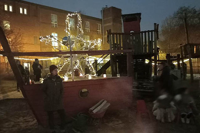 Auf dem Piratenspielplatz der Kita „Kleiner Fratz“ fand am 5. Dezember 2025 zum dritten Mal ein Kiez-Weihnachtsmarkt statt. Er öffnete um 16.30 Uhr seine Tore und war durch die bunte Beleuchtung schon von weitem zu erkennen. An den geschmückten Buden gab es Zuckerwatte und Kinderpunsch für die kleinen, Kaffee und Glühwein für die großen Besucherinnen und Besucher. Altersübergreifend konnte man sich mit Popcorn den Abend versüßen oder mit Waffeln oder diversen, heißen Suppen den Magen füllen. Die Preise waren moderat und die Erlöse gingen als Spende an das Kinderheim Santa Dorothea im peruanischen Cajamarca.