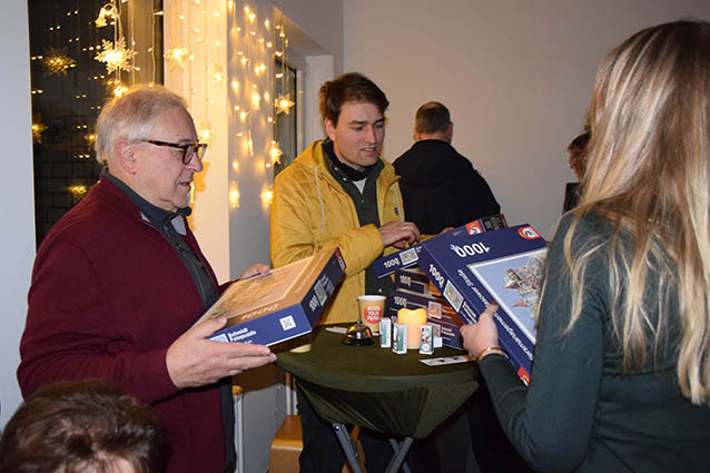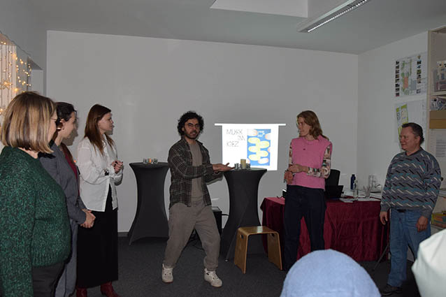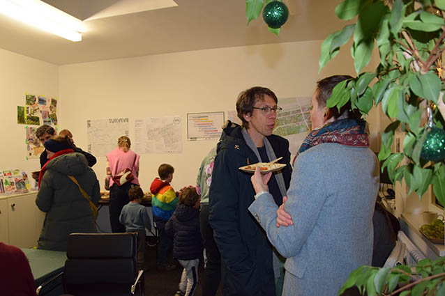 Das Quartiersmanagement hatte zur Weihnachtsfeier eingeladen und viele, viele kamen. Zeitweise war es so voll, dass man kaum aus dem Raum mit dem sehr leckeren Büfett ins andere Büro kam, um am Kiez-Quiz teilzunehmen oder mit dem WerkStadt Kulturverein Berlin e.V. Klänge zu erforschen. Zu den Gästen zählten Quartiersratsmitglieder, Mitglieder der Aktionsfondsjury, Vertretungen aus den Einrichtungen und Projekten, die beiden Gebietskoordinierenden Frau Scheffler aus der Senatsverwaltung für Stadtentwicklung, Bauen und Wohnen und Herr Stoof aus dem Bezirksamt Neukölln. Aber es gab auch neugierige Anwohnende, die einfach mal vorbeischauten. Und schnell kamen sie mit anderen ins Gespräch.