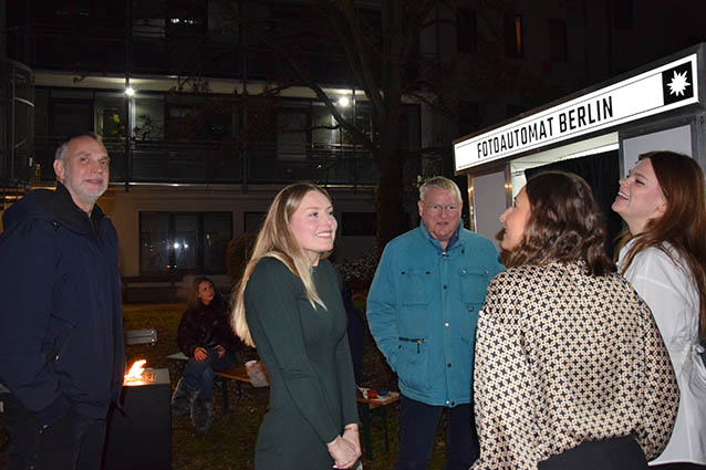 Auf dem Hof flackerte ein kleines Feuer, um das sich immer wieder Grüppchen versammelten und plauderten. Zeitweise entstand an dem Fotoautomaten gleich gegenüber, wo man sich für lau fotografieren konnte, eine Schlange. Neugierig versuchten die Jüngsten, unter den Vorhang zu schauen – was machen die denn da?
